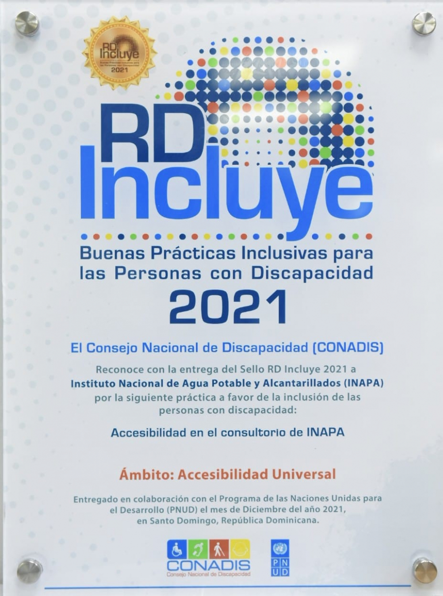 Santo Domingo.-El Instituto Nacional de Aguas Potables y Alcantarillados (INAPA) fue reconocida por el Consejo Nacional de la Discapacidad (CONADIS) con el sello “RD Incluye 2021”, por la práctica a favor de la inclusión de las personas con discapacidad, al facilitar la accesibilidad en su consultorio.