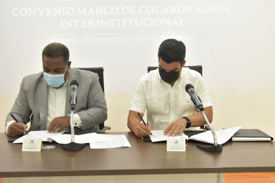 Santo Domingo. –  El Gabinete de Política Social y el Instituto Nacional de Aguas Potables y Alcantarillados (INAPA), firmaron este jueves un convenio en aras de aunar esfuerzos para mitigar los problemas estructurales de acceso a saneamiento mejorado y otros servicios básicos en comunidades en condición de vulnerabilidad social.