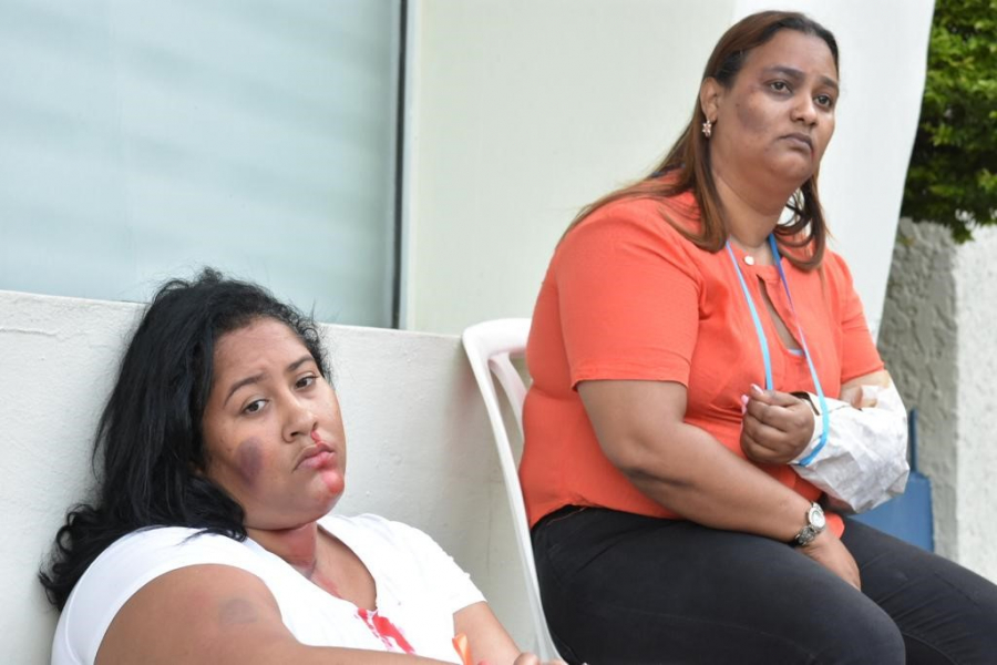 Santo Domingo.-Colaboradoras del Departamento de Equidad de Género del Instituto Nacional de Aguas Potables y Alcantarillados (INAPA) escenificaron un drama no hablado, representando la violencia física de que son objeto las féminas en la República Dominicana, con motivo del Día Internacional de la Eliminación de la Violencia contra la Mujer.