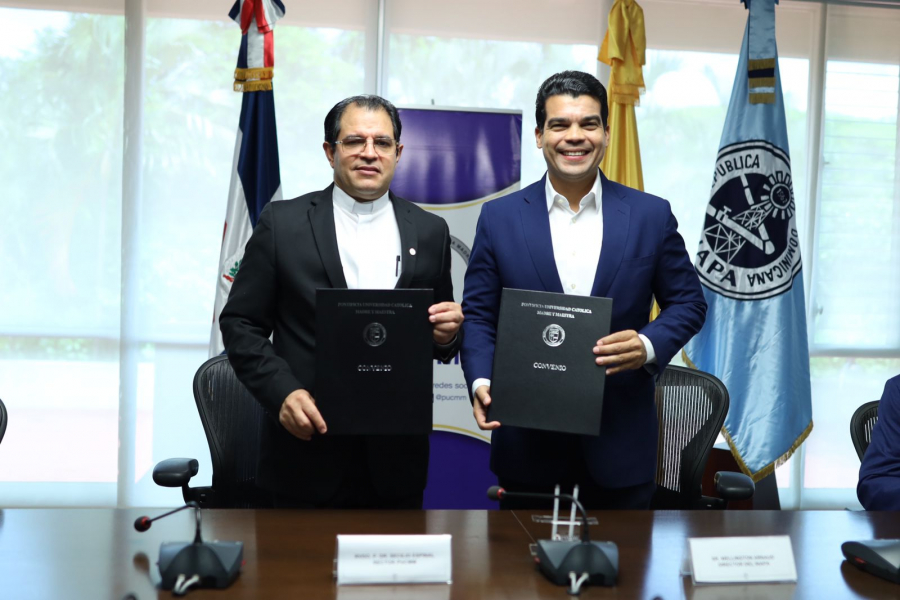 Santo Domingo.- El director ejecutivo del Instituto Nacional de Aguas Potables y Alcantarillados (INAPA), Wellington Arnaud, y el rector de la Pontificia Universidad Católica Madre y Maestra (PUCMM), reverendo padre Cecilio Espinal Espinal, firmaron un convenio de colaboración para desarrollar programas de capacitación, proyectos de investigaciones aplicadas, y colaboración en la divulgación y concienciación sobre el recurso del agua.